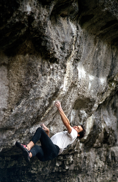 Jerry Moffatt Jerry on his own problem Superman, at Cressbrook, Peak District. Photo: Moffatt Collection